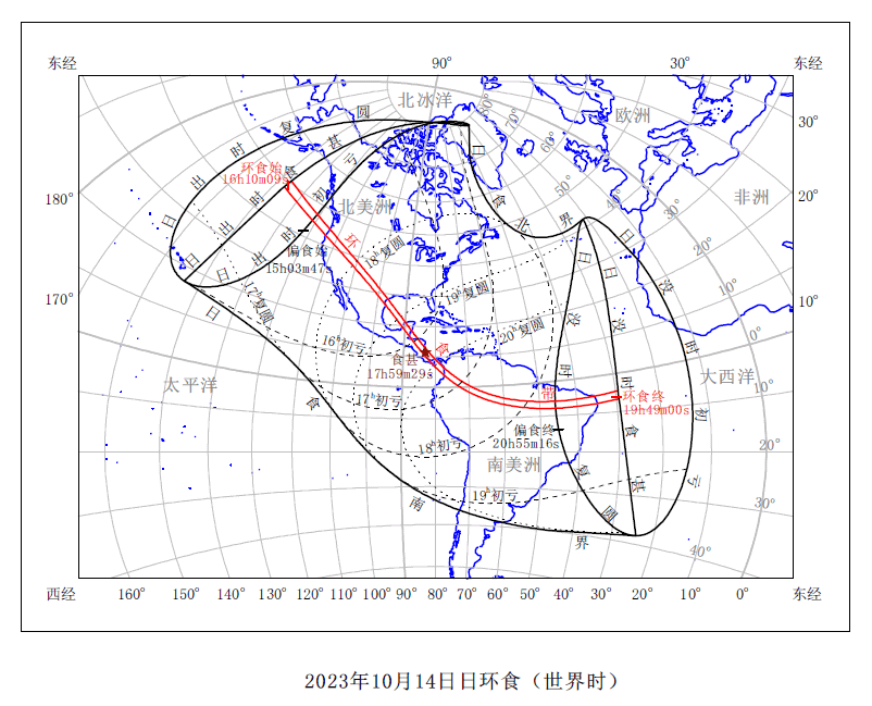 見食地區(qū):這次日食,環(huán)食帶從太平洋東北部開始,經(jīng)過美國、墨西哥、伯利茲、洪都拉斯、尼加拉瓜、巴拿馬、哥倫比亞、巴西,在大西洋西部結(jié)束。在北美洲(除極西部和極東北部)、南美洲(除南部)、太平洋東部、大西洋(除北部和東南部)、非洲極西部可以看到偏食。