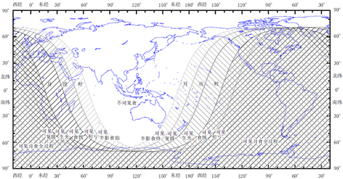 見食地區(qū):這次月食,在太平洋(除西北部)、大洋洲東部、北美洲南部、南美洲、大西洋、歐洲西南部、非洲、亞洲極西南部、印度洋西南部、南極洲可以看到。